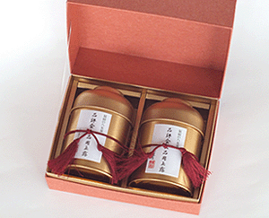 上級茶2本高級和紙缶詰め合わせ NO.H−2K40 税込 4300円 玉露 g1500円×80g高級和紙缶缶入 特上煎茶 g1500円×80g高級和紙缶缶入 大きさ16.5×12×8cm 重さ385g |